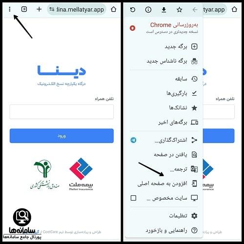 به منظور ورود به دینا ملت یار باید نشانی اپلیکیشن دینا dina.mellatyar.app را در مرورگر جستجو کرد. در ادامه صفحه اصلی نرم افزار دینا بیمه ملت نمایش داده خواهد شد. شایان ذکر است که افراد می توانند میانبر ورود به برنامه را به صفحه اصلی تلفن همراه افزوده تا در آینده مجبور به جستجوی نشانی سایت در مرورگر نشوند، زیرا بسیاری از افراد نشانی اپلیکیشن را فراموش می کنند. برای افزودن میانبر ابتدا باید روی سه نقطه در بالای مرورگر ضربه زد. در گام بعدی نیاز به کلیک بر روی گزینه افزودن به صفحه اصلی می باشد.